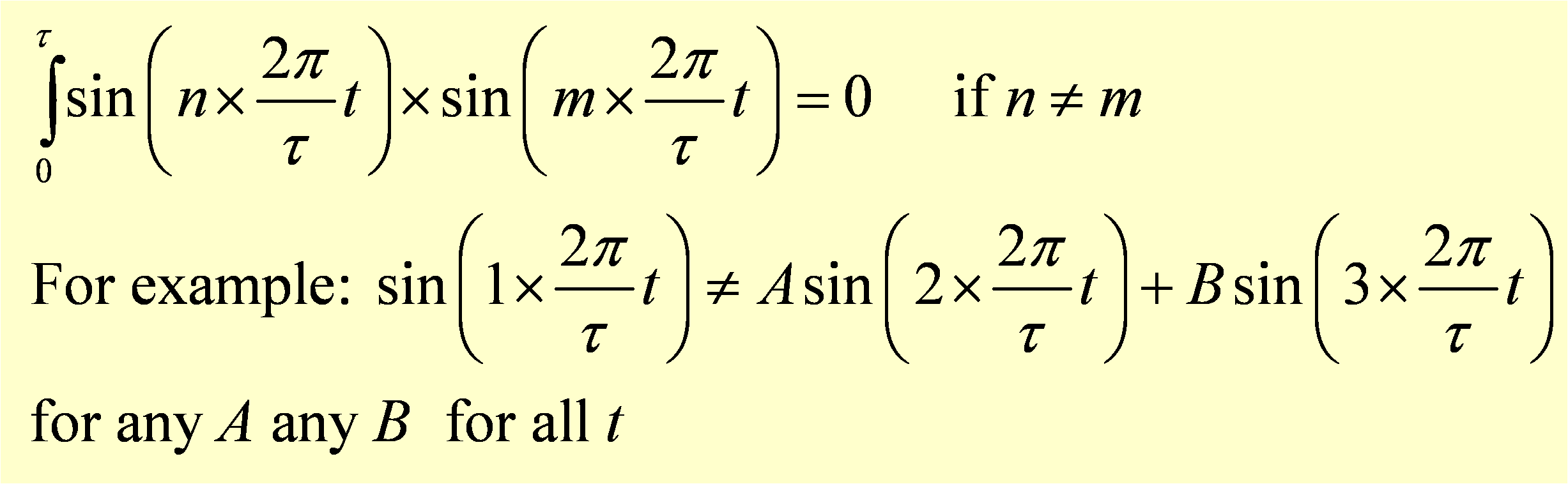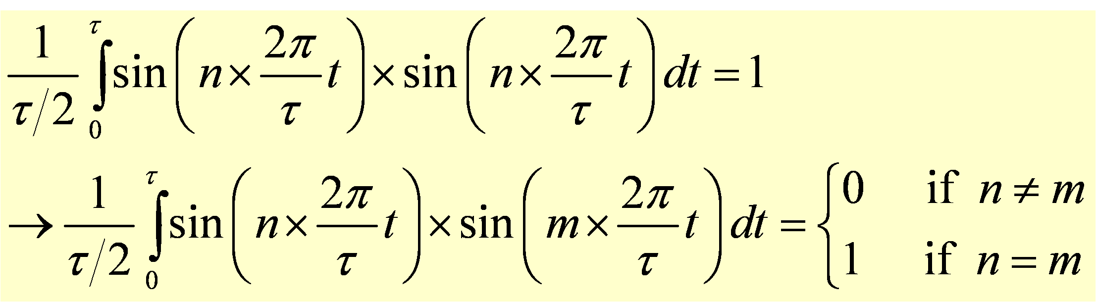 With vectors we used the dot product to check orthogonality of two components. In this case we multiply the two Fourier components and average them over time by integrating the product to see how much one component "overlaps" the other. This can be seen below: