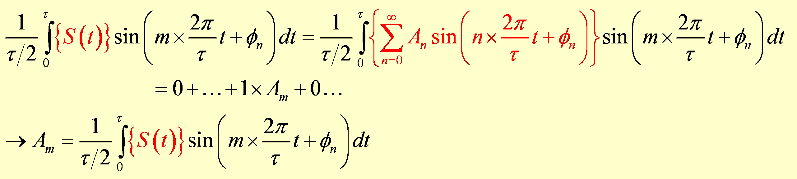 We can build a signal by adding sine waves, but we can also do the inverse by taking a signal consisting of a complicated waveform (such as a sound wave) and breaking it up into its Fourier components to allow quantitative analysis and manipulation of the signal. This is especially useful when a signal at a known frequency is buried in a wave containing strong noise at other frequencies. Using Fourier analysis one can pick out the desired signal by measuring the component that is at the signal frequency. This projection is analogous to how one determines the x-component of a vector by taking the dot product of the vector with the unit vector in the x direction, as was shown earlier on this page. For example, to determine the magnitude of the sinewave component at frequency ωm=m×2 π/τ contained in a function S(t), one simply multiplies the function by sin(ωmt) and integrates over one period τ. Due to orthogonality, the components in the series making up S(t) that are not at frequency ωm will vanish when multiplied by sin(ωmt) and integrated over one period. The only term in the sum that will remain is the part of S(t) that is exactly at frequency ωm. In this way we can determine the magnitude Am of the component at frequency ωm that contributes to S(t).