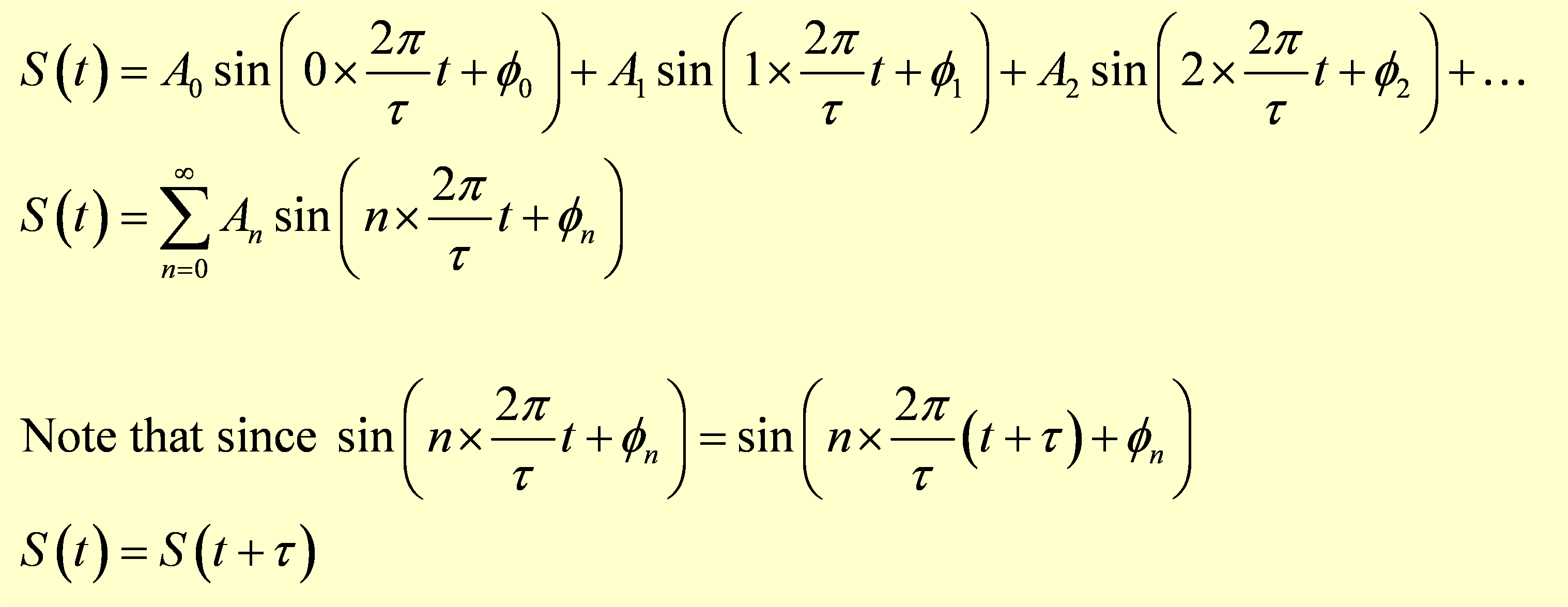 We will show that these frequency components are orthogonal using a mathematical operation that is analogous with the dot product for vectors, but first let's start with a function S(t) that is periodic, with a period τ. Since S(t) returns to the same value after time τ, all the frequency components making up S(t) must also return to the same value after time τ. Note that we have chosen to deal with a function of time, but S could be a function of position or any other variable. Since the frequency components are orthogonal, if one of them did not return to the same value after time τ, it would be impossible in general to use the other components to fix this and therefore all the components must repeat after time τ. Note that these components may have significantly shorter periods than τ, but that in each case their periods go into τ an integer number of times, and hence the components also repeat with period τ. As a result, S(t) can be represented by a discrete series of sine functions with non-continuous frequencies ωn=n×2 π/τ, where n is an integer from 0 to infinity. This discrete Fourier representation of a periodic function is shown below.