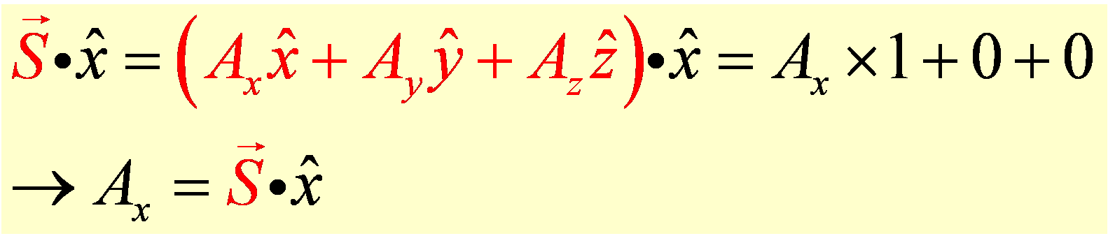 Since the dot product of unit vectors that are not in the same direction is zero, the only term that survives on the right hand side of the equation above is Ax, which tells us how much of the vector lies in the x-direction and is exactly what we wanted to find.