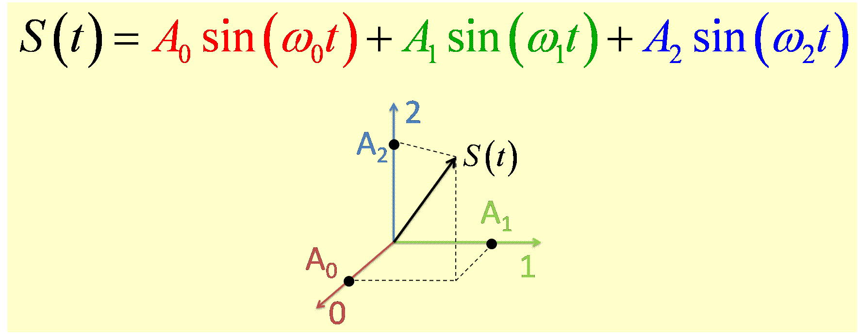 Here the amplitudes A0, A1, and A2 indicate the amplitudes of the sine waves at frequencies ω0, ω1, and ω2, respectively, which add up to form S(t).